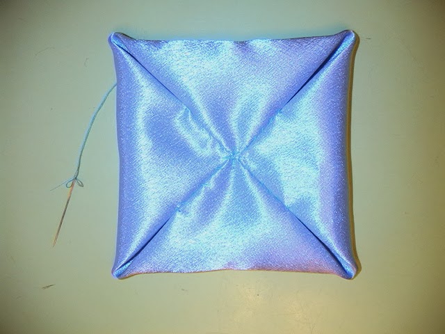 Мы нарезаем квадраты 20х20 см ("полезная площадь модуля - 5 см) / Намечаем центр / уголки складываем "конвертиком" / закрепляем по-центру / потом ещё раз / закрепляем по-центру и сшиваем конвертик до-середины / переворачиваем и складываем конвертик в обратную сторону, закрепив по-центру / Готовые модули и мой помощник